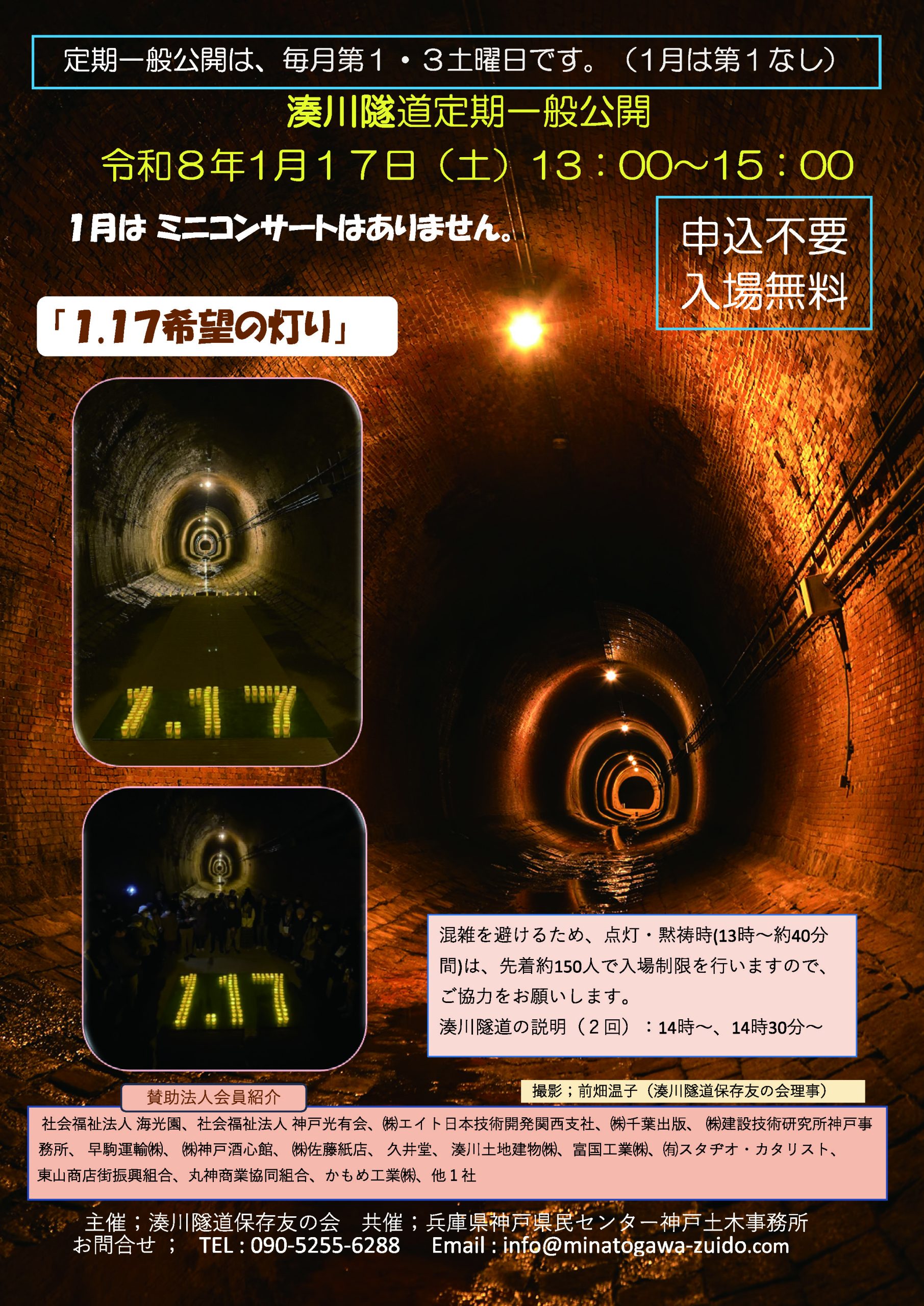 このため、湊川隧道保存友の会は、平成25年から隧道内に灯籠を並べて、東遊園地の’希望の灯り’から分灯した灯でご来場された方々に竹灯籠に点灯してもらい全員で震災犠牲者の追悼をしております。