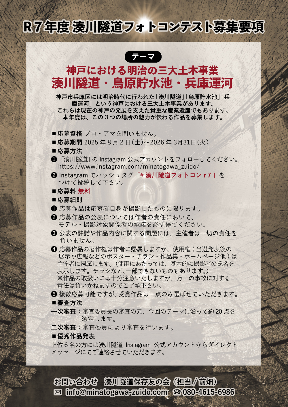 Instagramで「#湊川隧道フォトコンr7」をつけて投稿すると応募完了となりますので、是非応募してくださいね!