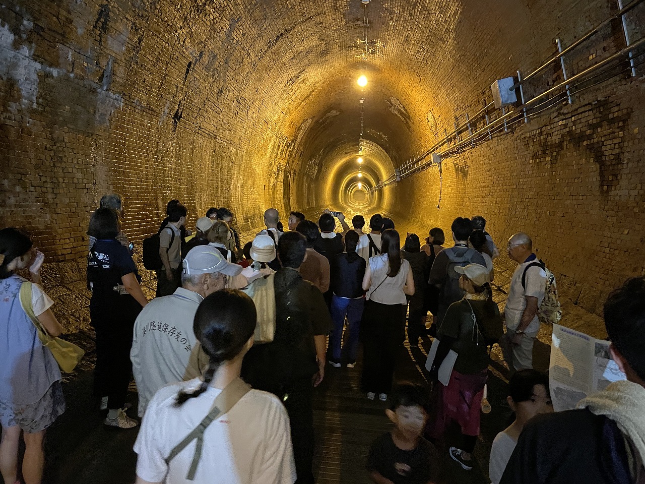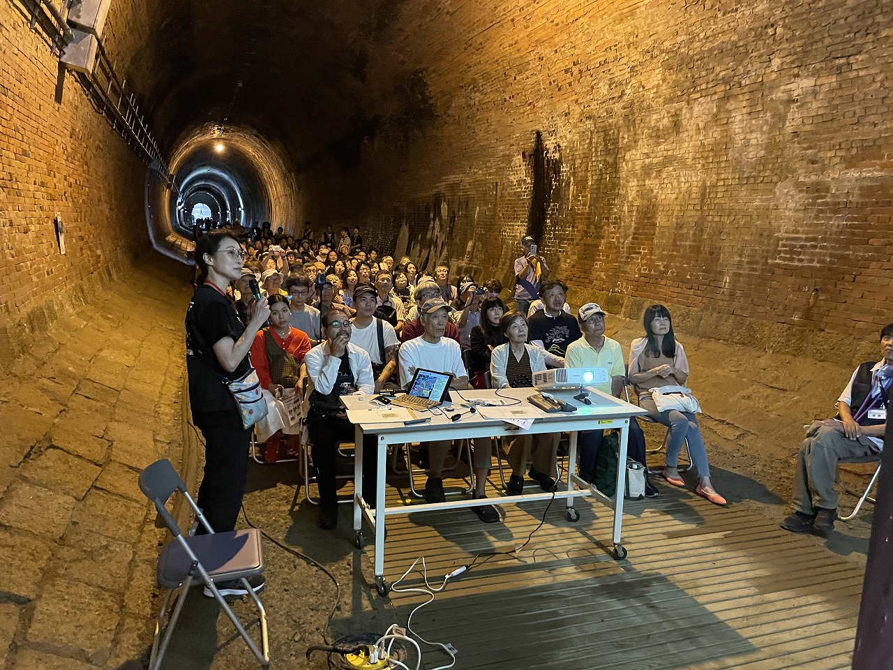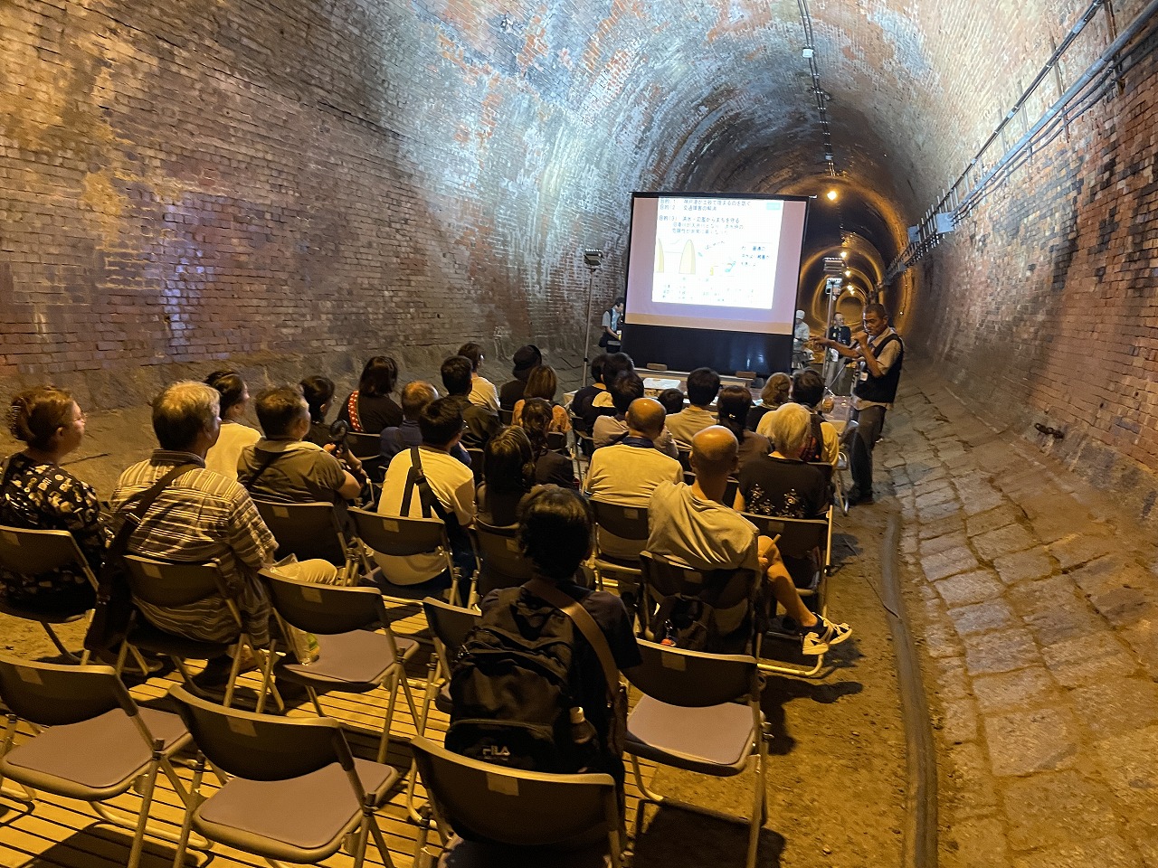 隧道内にでは、スライドを使った説明会を開催しています。